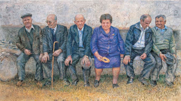 Fou en Joan Company, el director de la Coral de la Universitat de les illes Balears, qui em menà per primera vegada a l’estudi del nostre pintor i, tot i que els grans formats eren paisatges urbans, no hi faltaven, ni estudis de detall dels mateixos, ni apunts ben acabats de flora, fauna, ruralia o personatges. Quins descobriment el meu d’en Xisco Fuentes com pintor de personatges, tant els del seu poble de naixement, Serpio, entre Albacete i Granada, “si ha d’anar a posta”, “les carreteres acaben allà”, com els de Mallorca mateix, Vilafranca, Sineu, Bunyola o una doneta asseguda al banc de l’Ajuntament de Palma, “el banc del si no fos”, amb les cametes que no li arriben enterra. A Mallorca, també, un temps si havia de venir aposta, no com ara, amb tantes carreteres que no se sap on acaben.