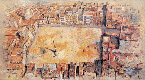 Hom podria creure que el que és inevitable, i ara hem de passar als paisatges, és la seva destrucció. I més en els paisatges urbans, als quals els sol passar per damunt el que els urbanistes italians denominaren massa gràficament, “l’esventramento”. Textualment : el desventrament. Obrir i treure els budells, la melsa i la bufeta de la ciutat, suposadament malaltes, i col.locar-hi, dins el ventre obert, uns nous òrgans, més funcionals, qui sap si més asèptics. Sempre més nous. Quan el pintor cridava, de la manera que criden els bons pintors, a través de les seves teles i les seves feines, els responsables, aquests si que ho eren asèptics, solien dir : “tal vegada s’hagués pogut, ...però és inevitable.” I així, la desmemòria de la ciutat, era substituïda pels òrgans nous, nous barris edificats de bell nou damunts les runes dels anteriors, però, sense cor i sense passat. Aquí, justament aquí, hi penetra la inevitable memòria d’en Xisco Fuentes.
