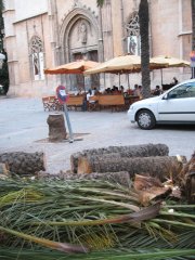 1.- Rèquiem per una palmera. A la plaça de la Llonja de Palma, hi ha palmeres. Algunes altíssimes i altres no tant. Després de col·leccionar, com sempre compulsivament, imatges de l’edifici gòtic de davant ca meva, puc arribar a postular el següent. Hi havia 12 palmeres, quatre, quatre i quatre, als tres costats de la plaça de la Llonja davant l’entrada, al timpà de la qual hi ha l’Àngel Custodi, “defenedor de la Mercaderia”. Les quatre que són a la part del que després fou el Passeig de Sagrera, enllestit per l’arquitecte Gaspar Bennàsser l’any 1910, les sembraren l’any 1894, ara només en queden dues, tenen 113 anys. Les demés les sembraren l’any 1900, d’aquestes en tallaren recentment una, fa deu anys, i una altra la setmana passada, també només en queden dues d’aquesta anyada. La resta han estat resembrades i són més petites. Les més altes fan una trentena de metres i s’eleven més que la Llonja. No feia molt que vivia a la plaça, quan un dematí vaig sentir parlar, fort, en valencià, prop de la finestra de la meva cambra. Vaig obrir les persianes i un personatge, que després em digué que era d’Alcoi, sostingut amb un lligam com de corda d’amarrar vaixells, uns ormejos amb pues a les sabates i com una destral rara, podava les palmeres i les violes de dàtils. Vaig conversar amb ell, jo al balcó, ell penjat a l’arbre, i em va descobrir quina les feia més bons, rodonets i dolços: la més baixeta, ben enfront de l’àngel.